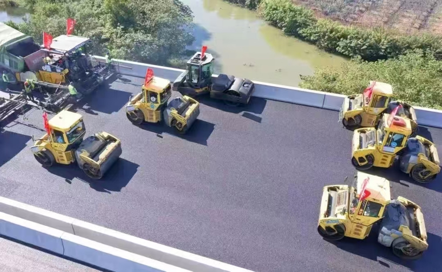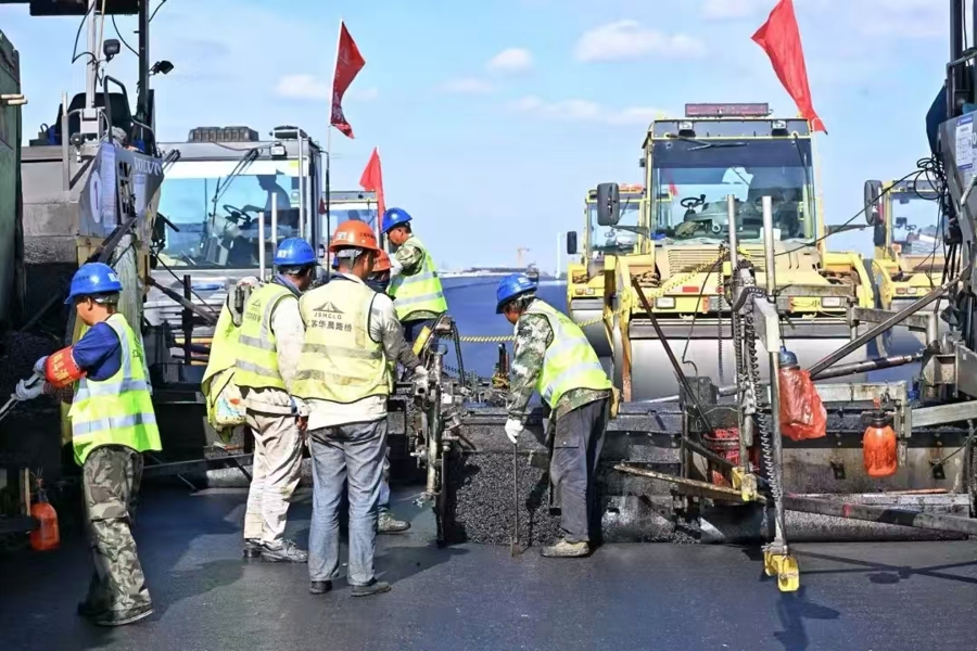 近日,随着最后一车沥青混合料摊铺、碾压完成,江阴靖江长江隧道南接线项目主线桥沥青上面层铺设圆满收官,为力争2025年底主体工程基本建成目标奠定坚实基础。